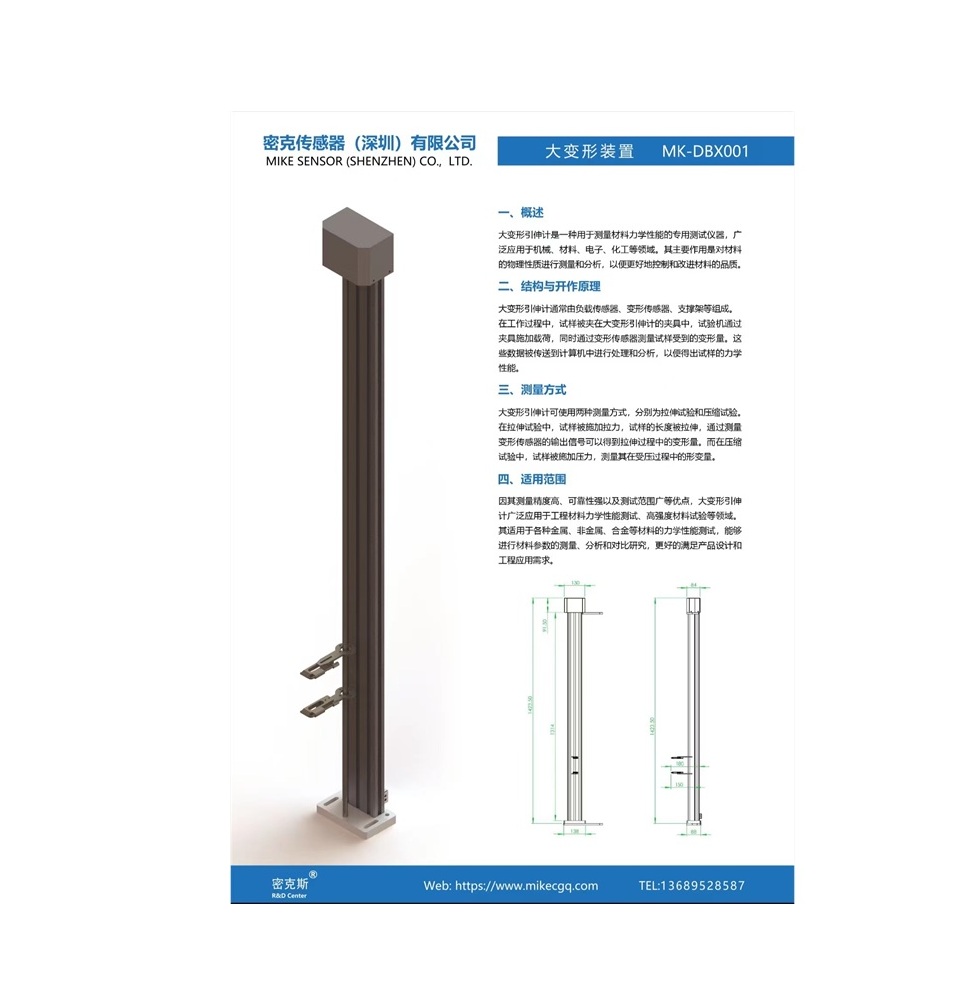 大變形引伸計MK-DBX0011、概述大變形引伸計廣泛應用于機械、材料、電子、化工等領域。其主要作用是對材料的物理性質進行測量和分析
